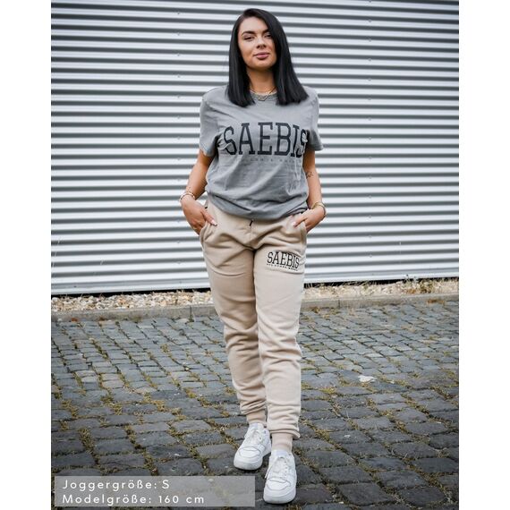 Unser Model ist 160cm groß und trägt die Jogginghose in Größe S.