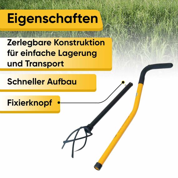 - Der Handgriff besteht aus einem erleichternden Stahlrohr mit einer speziellen Biegung, um das Gerät beim Ausbilden der Landelöcher um 360 Grad drehen zu können.