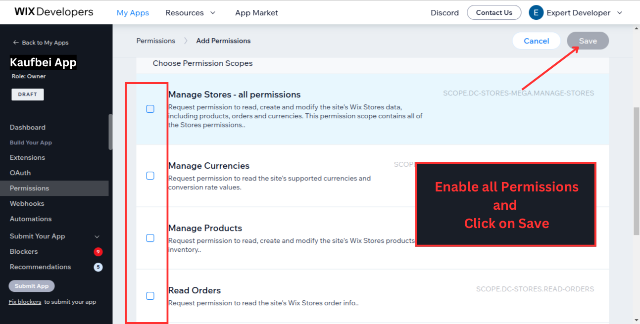 Schritt 6: Aktivieren Sie alle Berechtigungen und klicken Sie oben rechts auf die Schaltfläche „Speichern“.