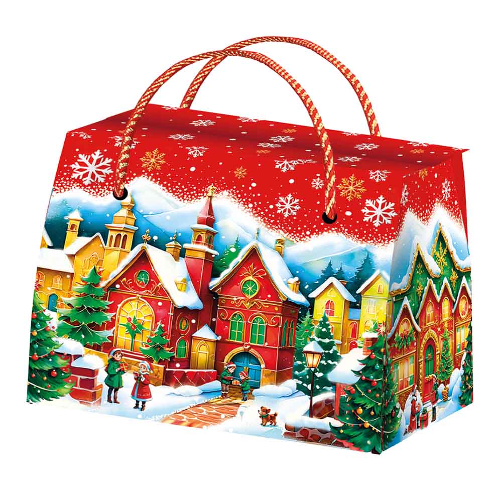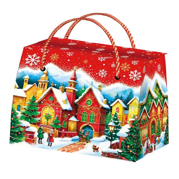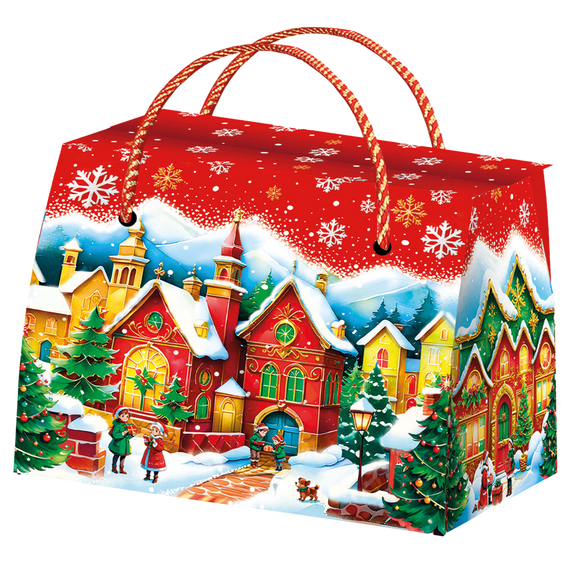 Weihnachtskarton „Wintermärchen“ zur Verpackung von süßen Geschenksets für Kinder, Schokoladenpralinen und Souvenirs.Selbstaufbauender Karton mit Kordelgriffen an der Oberseite.