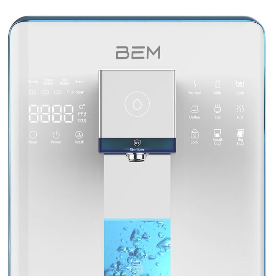 - UVC-Sterilisation – integrierte UV-Lampe beseitigt bis zu 99,9 % der Bakterien vor der Wasserabgabe und verhindert die Vermehrung von Keimen im internen Tank