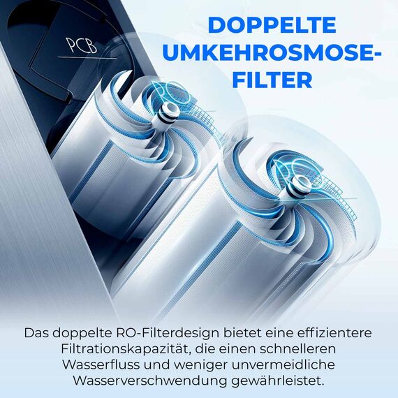- DOPPELTE UMKEHROSMOSEFILTER: Das doppelte RO-Filterdesign bietet eine effizientere Filtrationskapazität, die einen schnelleren Wasserfluss und weniger unvermeidliche Wasserverschwendung gewährleistet.