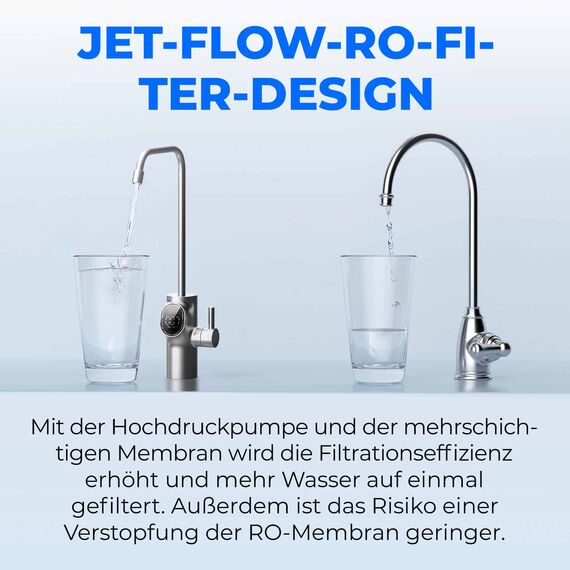 - JET-FLOW-RO-FILTER-DESIGN: Mit der Hochdruckpumpe und der mehrschichtigen Membran wird die Filtrationseffizienz erhöht und mehr Wasser auf einmal gefiltert. Außerdem ist das Risiko einer Verstopfung der RO-Membran geringer.