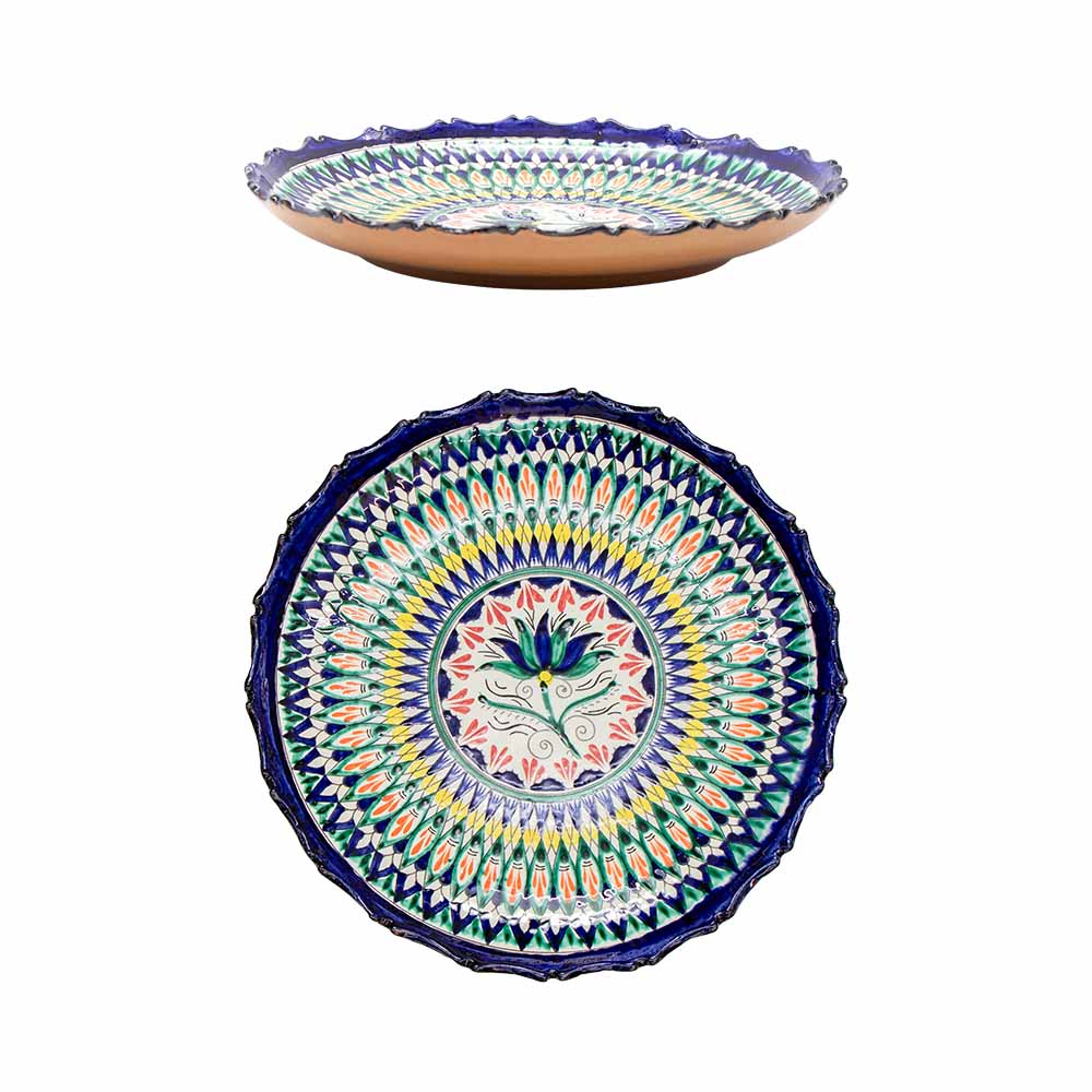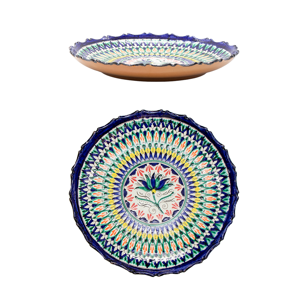 Der „Lagan Mechrob“ mit dekorativem Wellenrand – ein kunstvolles Servierstück für besondere Anlässe! Dieser handgefertigte Keramik-Lagan (Ø 32 cm) vereint traditionellen Mustermix mit einem elegant geschwungenen Rand, der dem Design eine verspielte Note verleiht. Durch die aufwendige Handarbeit usbekischer Kunsthandwerker erhält jedes Stück seine individuelle Ausstrahlung – leichte Abweichungen in Muster und Größe machen Ihren Lagan zu einem exklusiven Unikat. Die großzügige Fläche und der kunstvolle Rand machen ihn perfekt für festliche Gerichte, Obstarrangements oder als dekorativen Mittelpunkt Ihrer Tafel.Besonderheiten: