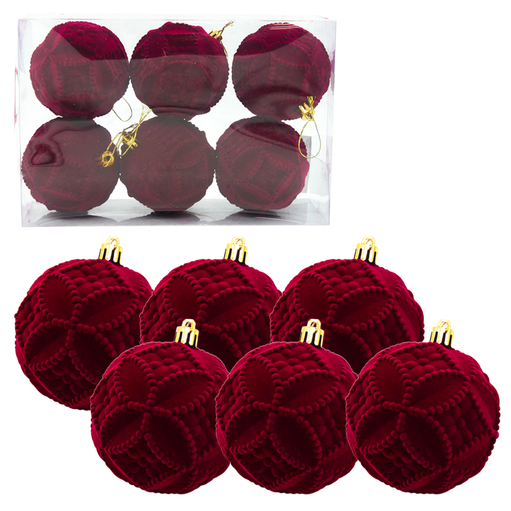 Weihnachtskugeln in sattem Rot mit geometrischem Design sind ein moderner und stilvoller Akzent für Ihre Festdekoration.Sechs Kunststoffkugeln mit einem Durchmesser von 8 cm eignen sich perfekt für den Weihnachtsbaum im Stil des festlichen Barocks, des skandinavischen Minimalismus oder des sowjetischen Retros.