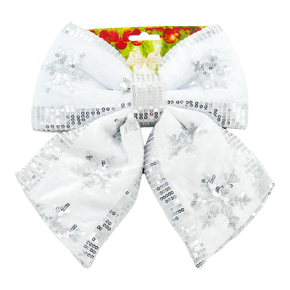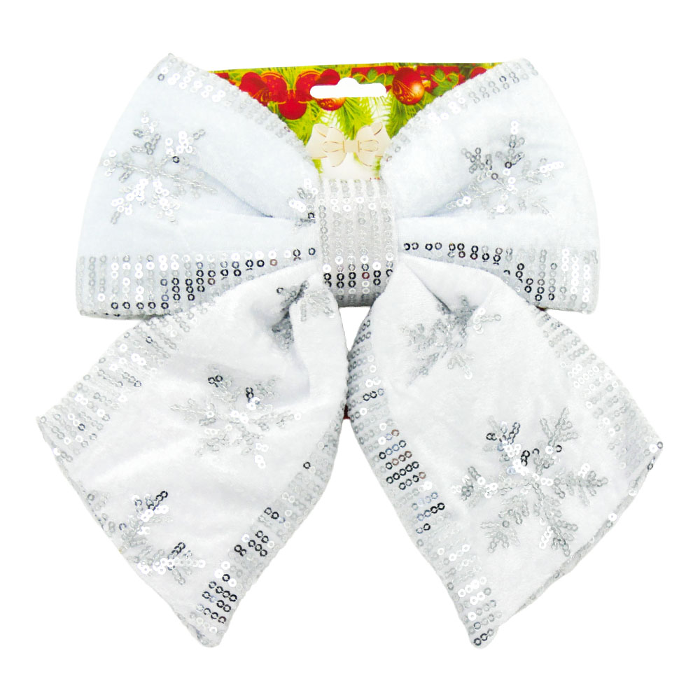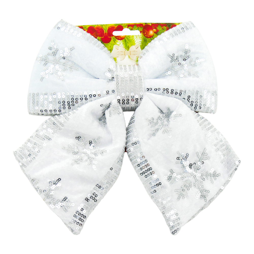 Die dekorative Schleife „Merry Christmas“ ist ein funkelnder Blickfang für Ihre Weihnachtsdekoration.Die weiße Farbe mit glitzernden Schneeflocken und Pailletten verleiht dem Interieur winterliche Frische und festlichen Glanz.