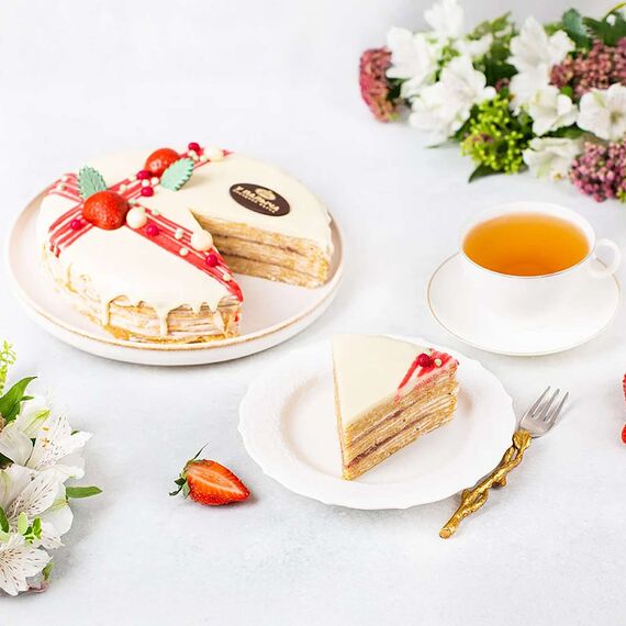 Ein einzigartiges Dessert aus hauchdünnen, nach hauseigenem Rezept gebackenen Pfannkuchen ohne Hefe, verfeinert mit hochwertiger Vollmilch. Jede Schicht ist mit einer samtigen Buttercreme und einer Füllung aus sonnengereiften Erdbeeren durchzogen. Für ein besonderes Aroma sorgt eine hausgemachte Erdbeermarmelade. Abgerundet wird diese Köstlichkeit mit einer Ganache aus echter weißer Schokolade, dekorativen Schokoladenerdbeeren, dunklen Schokoladenblättern aus edlen Kakaoprodukten und einer zarten Streuung aus knusprigem Puffreis.Eigenschaften: