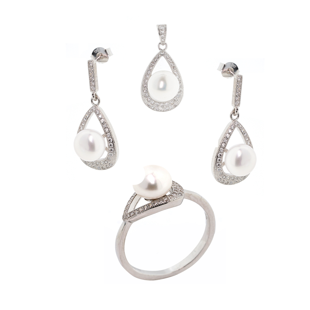 Schmuckset in Tropfenform aus 925 Silber mit Perle und Zirkonia
