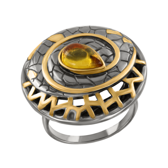 Auffälliger Damenring aus Silber 925, vergoldet, rhodiniert, mit Bernstein